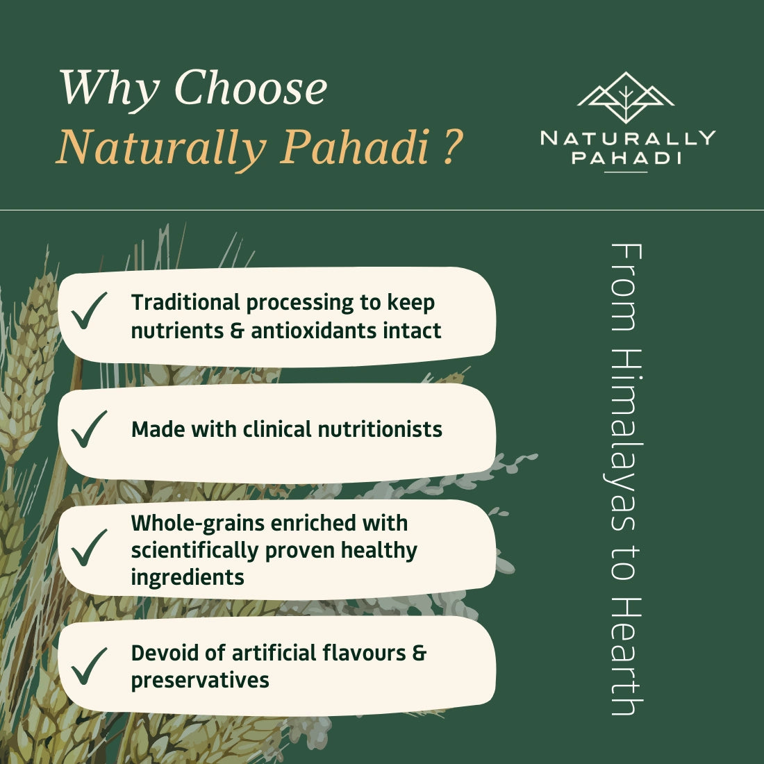 Sourced from the mineral-rich hill farms of the Himalayan belt, these grains are naturally grown and cold-milled in small batches to lock in nutrients, flavor, and freshness โ without preservatives. Packed with fiber, protein, calcium, iron, and antioxidants, this flour supports blood sugar management, digestion, weight control, and heart and bone health.